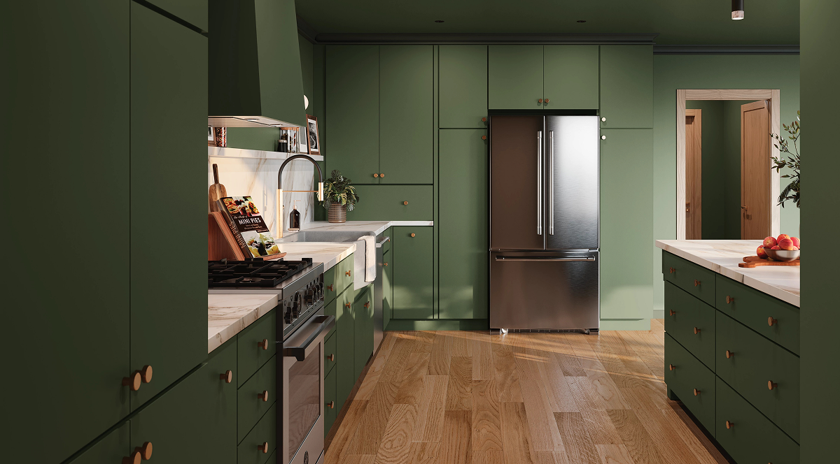 BASE CABINETS, ISLAND & HOOD: Tavis | Maple | Muted Moss PANTRY CABINETS: Tavis | Maple | Hearthstone