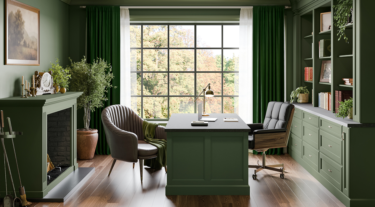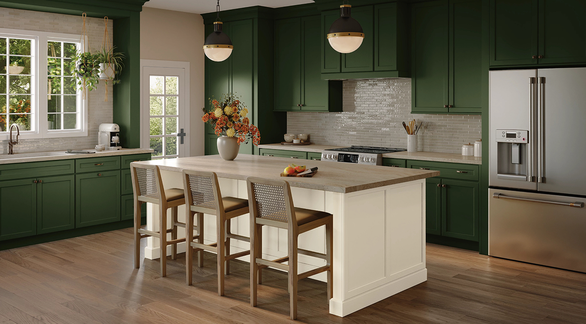 CABINETS: Tavis | Maple | Muted Moss ISLAND & HOOD: Tavis | Maple | Hearthstone